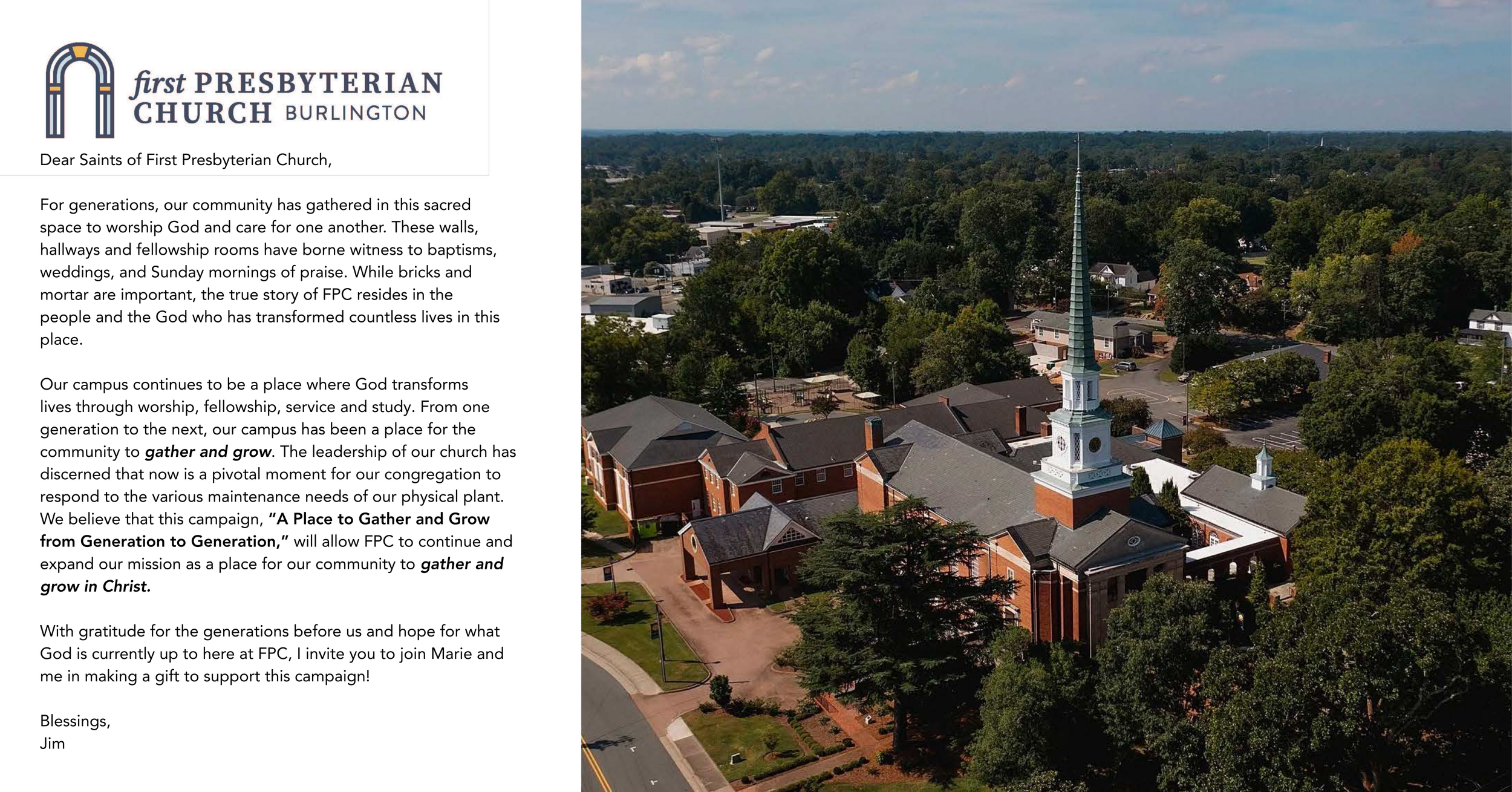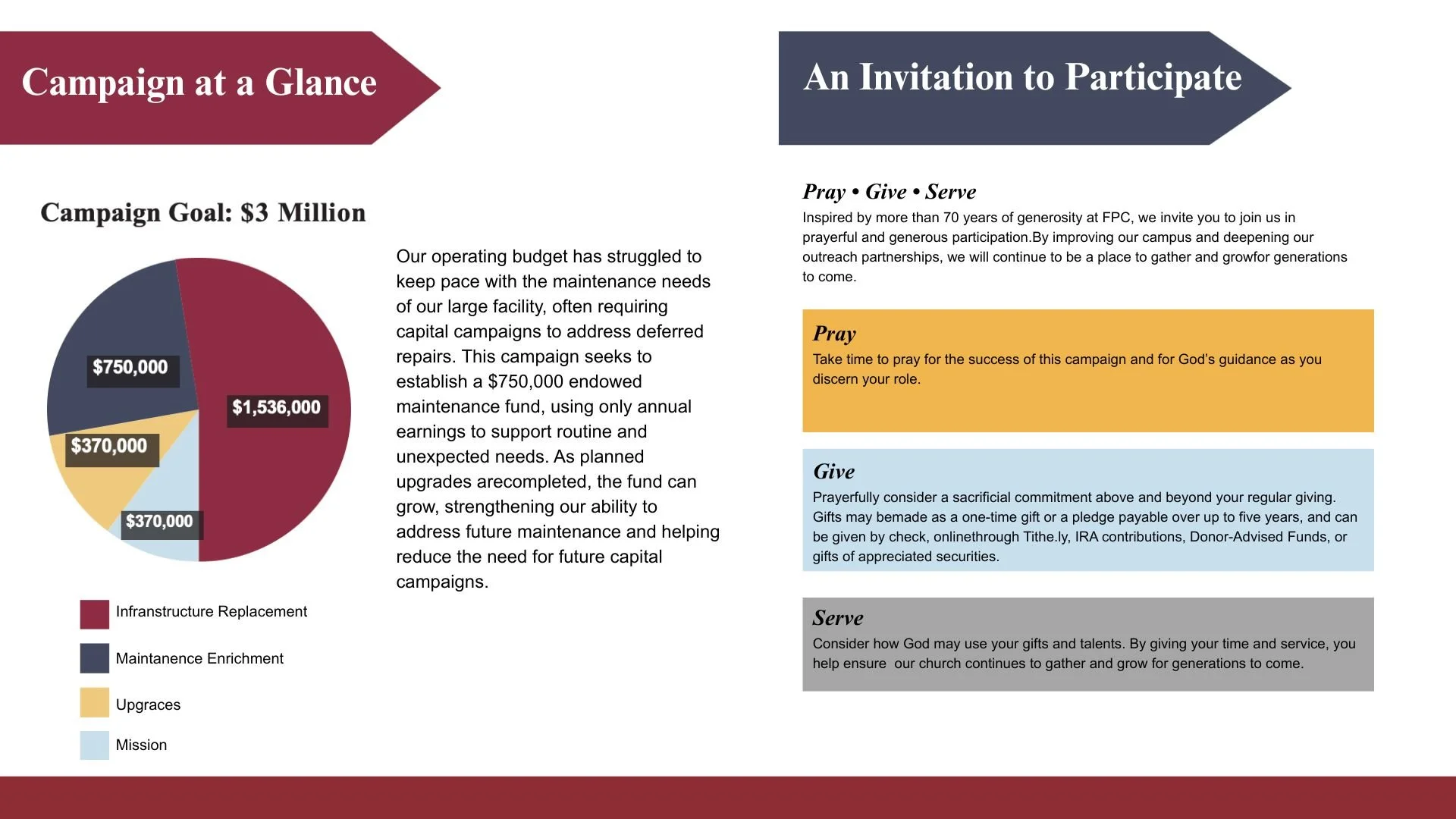 Our annual budget covers the day-to-day operations, staff, and programs of the church. This capital campaign is a "second mile" request for extraordinary capital needs that fall outside our yearly operating expenses. We ask that members maintain their regular tithes while considering an additional gift to this campaign.