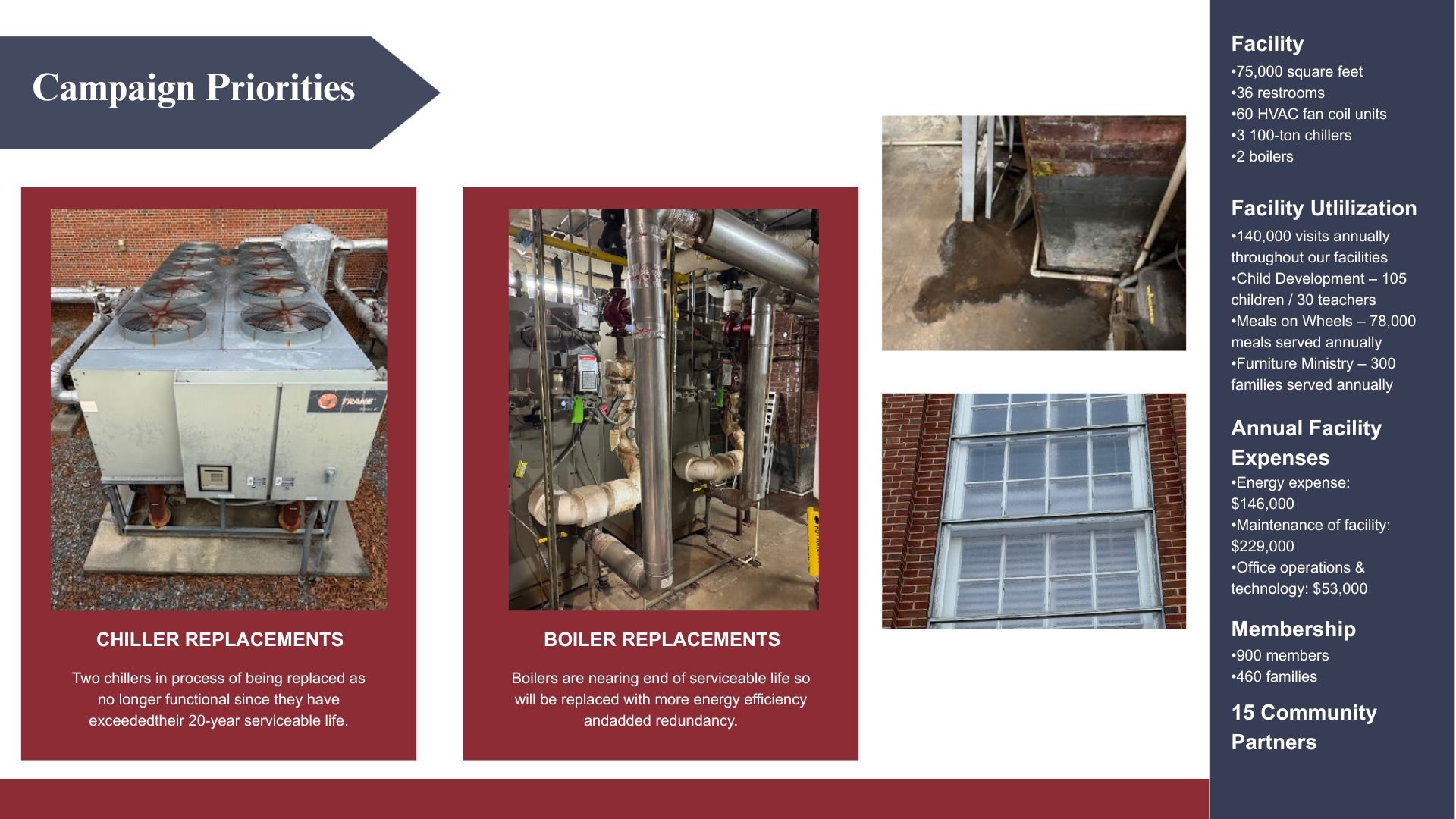 Immediate Needs ($1.25 million): Replacing the 25-year-old HVAC systems and urgent structural repairs.