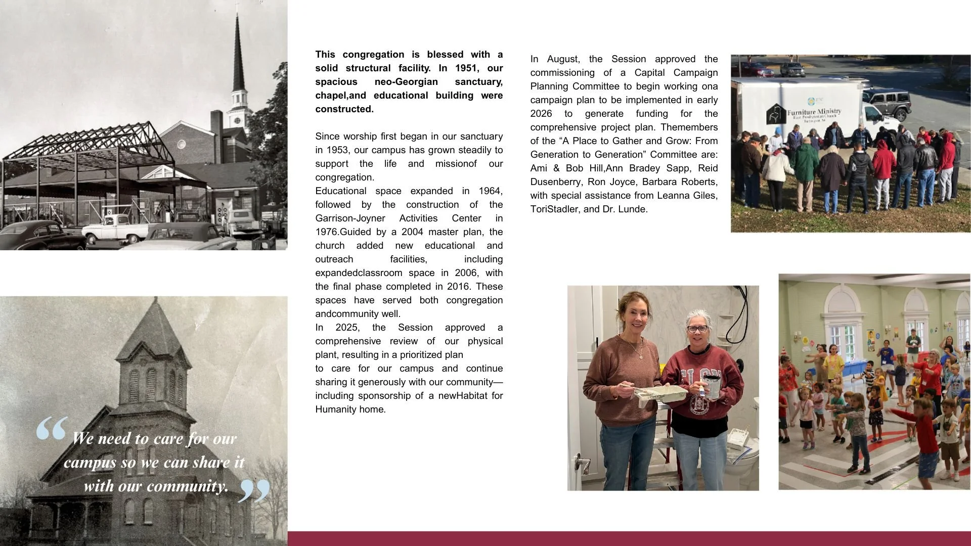Historically, we have addressed building issues as they arise. By establishing an endowed Foundation fund for physical plant maintenance, we are moving toward a proactive model. This endowment will generate interest to cover routine repairs, ensuring we remain good stewards of our resources and avoid emergency campaigns in the future.